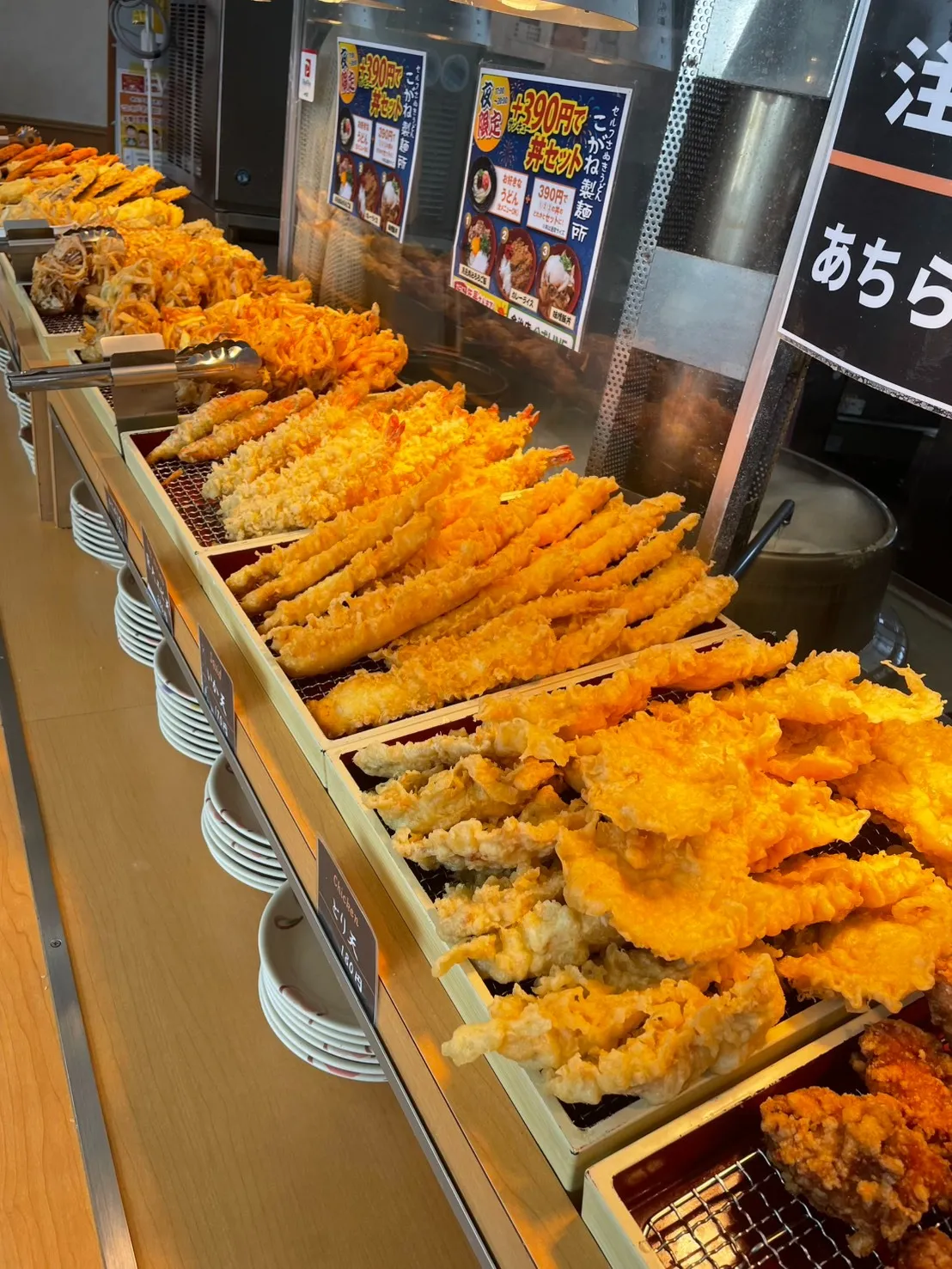 当店では、打ちたて・茹でたてのうどんはもちろん、ずらりと並んだ自慢の**「揚げたて天ぷら」**をご用意して皆さまをお待ちしています。写真の通り、エビやちくわ、野菜天など、どれにしようか迷ってしまうほどのボリュームです!